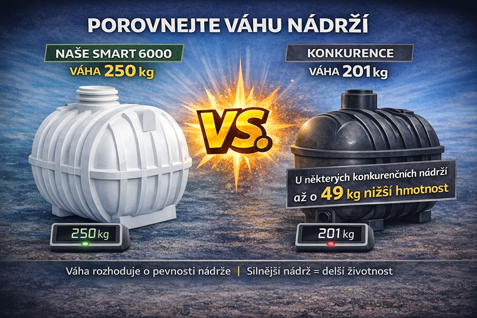 Plastové jímky a nádrže od výrobce Plastsvar mají vyšší hmotnost a silnější konstrukci než běžné levné nádrže. Vyšší hmotnost znamená větší tloušťku stěny, vyšší pevnost a delší životnost. Naše nádrže jsou navrženy tak, aby odolaly tlaku zeminy a byly vhodné pro dlouhodobé uložení v zemi.
