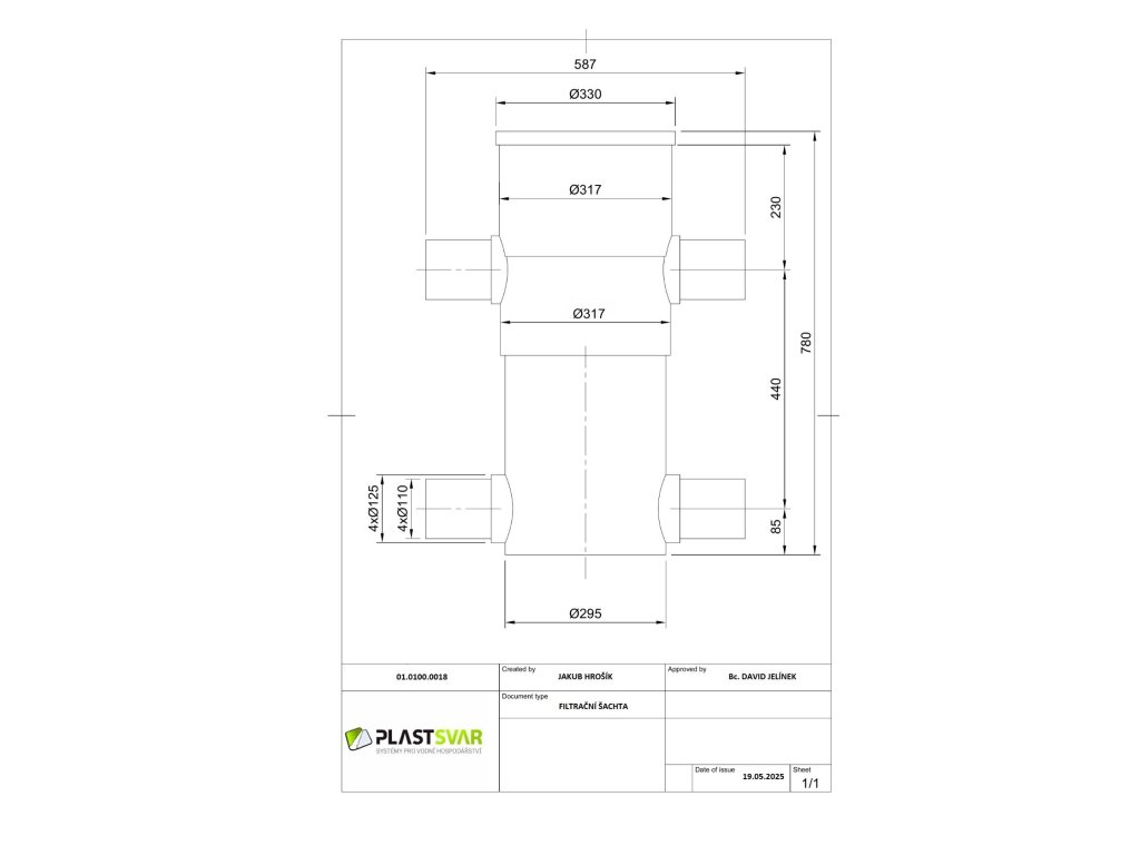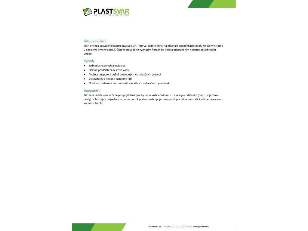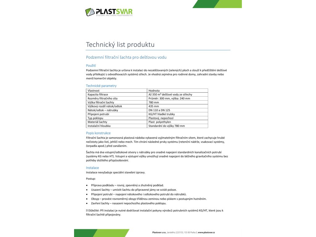Filtrační šachta je vyrobena z kvalitního plastu odolného vůči vlhkosti, mrazu a běžným chemickým vlivům.
