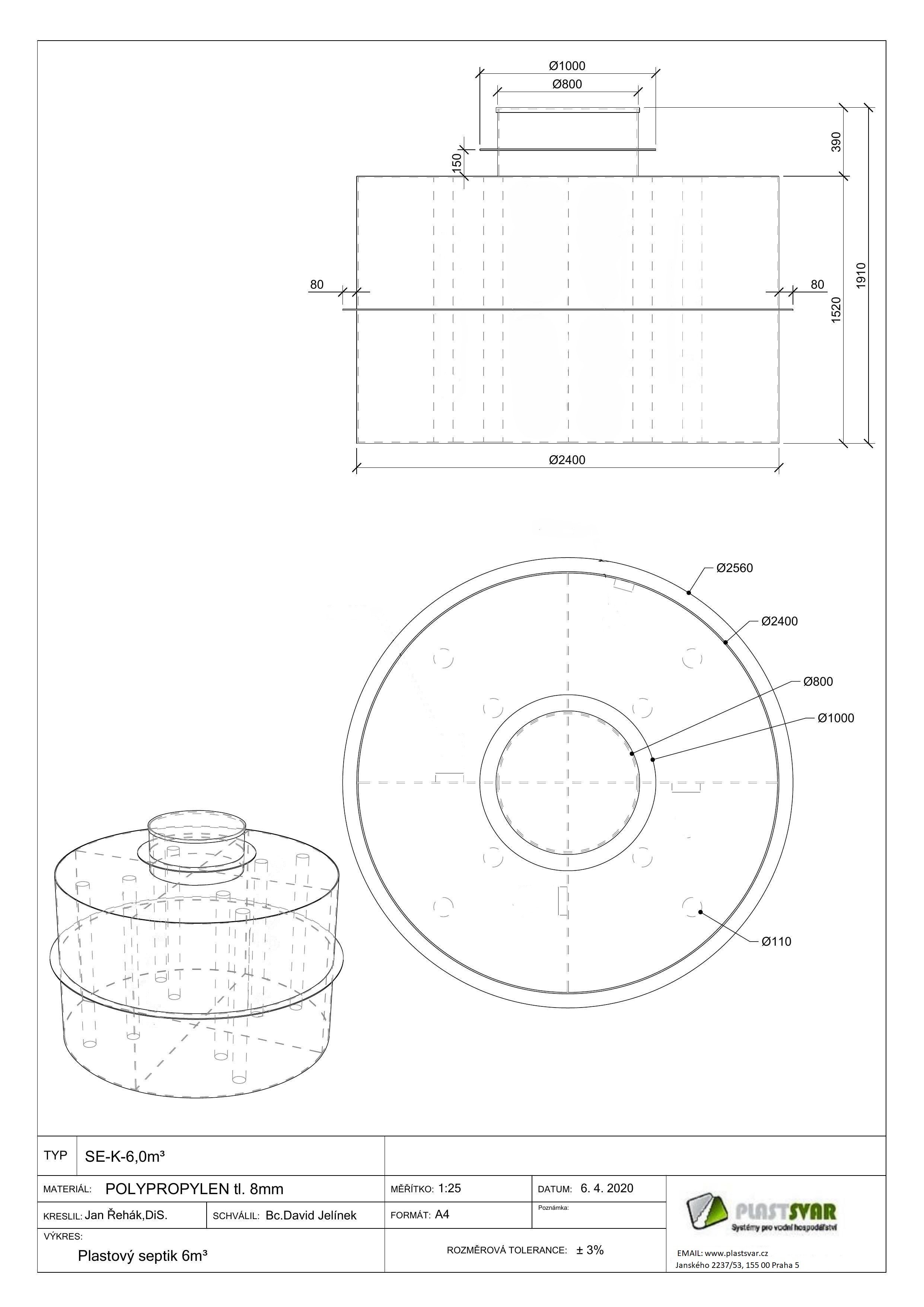 Nátok a odtok je řešen dle požadavku zákazníka ale v průměrech potrubí DN 110 odtok a Nátok 160 mm. Septik je vyrobený technologií svařování plastů. Materiál PP tl.8 mm. Jedná se o septik vyrobený na kvalitní svářecí poloautomatické svářečce WEGENER a za použití ručních svářecích strojů švýcarské firmy Leister.